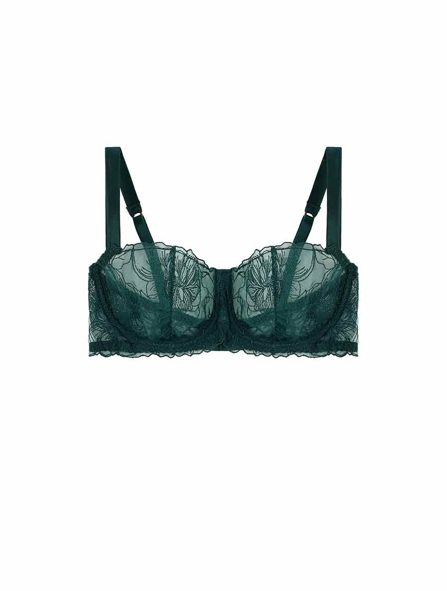 This season our classic balcony bra style has been crafted using exquisite forest green soft voile, adorned with Fleur’s Hand-drawn embroidery design of the magnolia flower. The Eva Balcony Bra features a double layer cup for a sheer supportive fit, adjustable silk encased straps with 24-carat gold plated hardware for that extra touch of elegant luxury.
