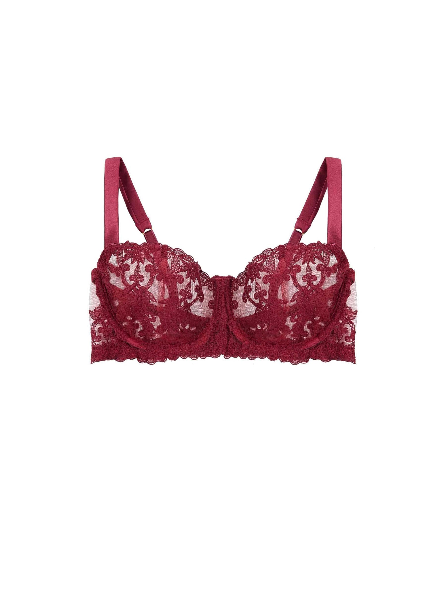 Introducing the captivating bespoke embroidery design that is Gisele. Born out of the Onyx bespoke embroidery, this best-selling embroidery design has been reimagined in an alluring shade of cranberry red. This dark red balcony bra features Fleur’s hand-drawn embroidery on delicate sheer Italian tulle, finished with silk straps and 24-carat gold-plated hardware for a touch of elegant luxury. Crafted by our friends in Europe, the Gisele Balcony bra provides more coverage than our demi and plunge styles, offering a subtle uplift and a rounded shape.