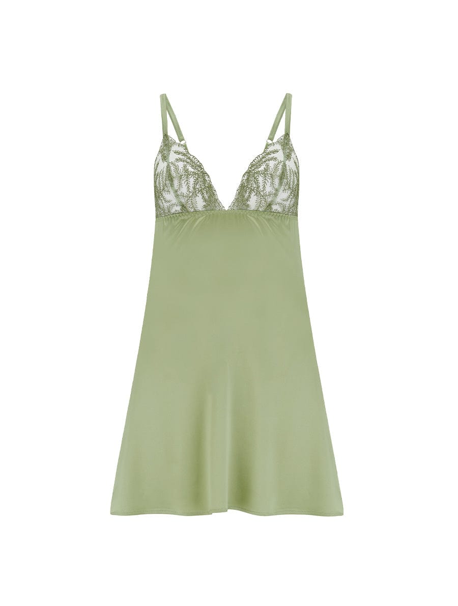 Front view of model wearing Fleur of England Luxury Sage Green Silk babydoll