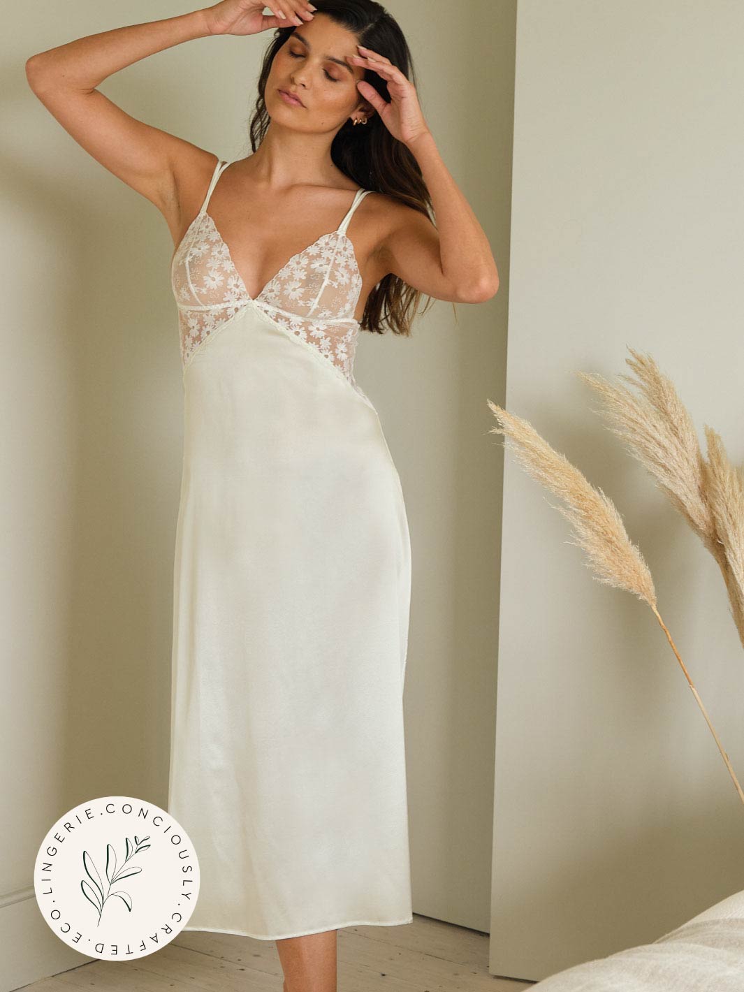 The Daisy silk dress is an update to the classic Fleur of England Babydoll design. The midi length slip dress in ivory is crafted in 90% silk with added 10% elastane for a luxuriously soft feel. Embroidered elegant daisy design onto soft recycled tulle base adorn the soft cups. Silk encased, double elastic straps are paired with 24-carat gold plated rings and sliders, leading to a backless design with panels of embroidery providing coverage to the side of the body.