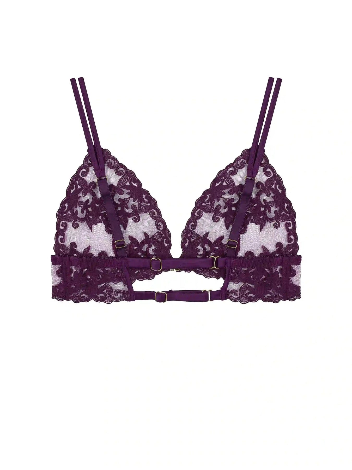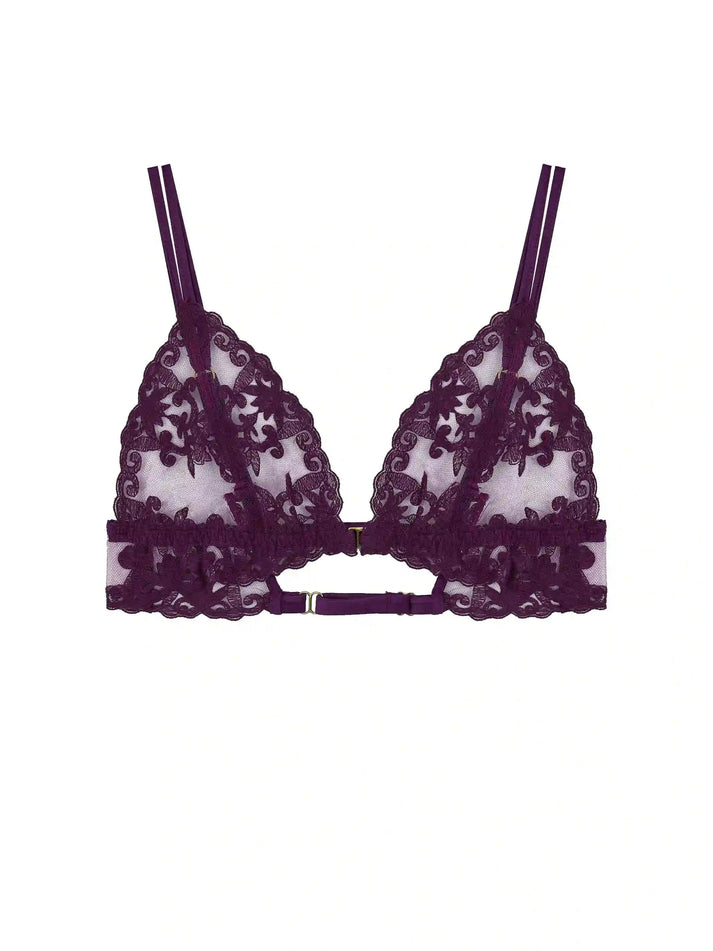 Our bestselling non-wired bra with an easy front fastening 24k gold-plated hook. Crafted in a deep shade of purple, this timeless piece features soft triangle cups adorned with bespoke embroidery, with a lightly elasticated underbust and adjustable back straps.