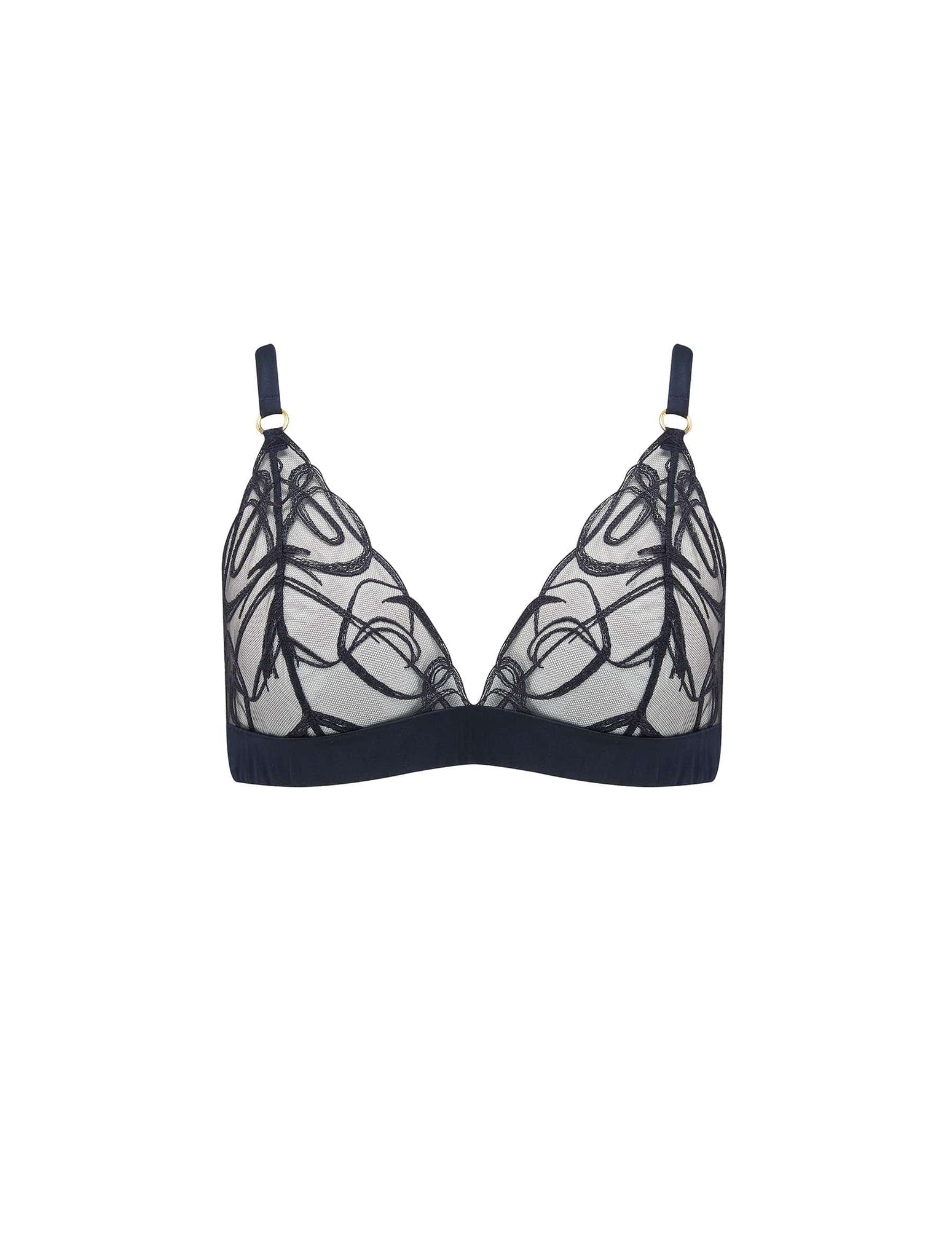 The staple Fleur of England boudoir bra has been boldly redesigned in the Fridar collection, crafted in deep midnight blue. This soft-cup bra is perfect for day-to-night wear due to its comfortable fit and daring design. It features Fleur’s brush stroke embroidery and gold-plated rings connecting the soft silk straps to the sheer cups.