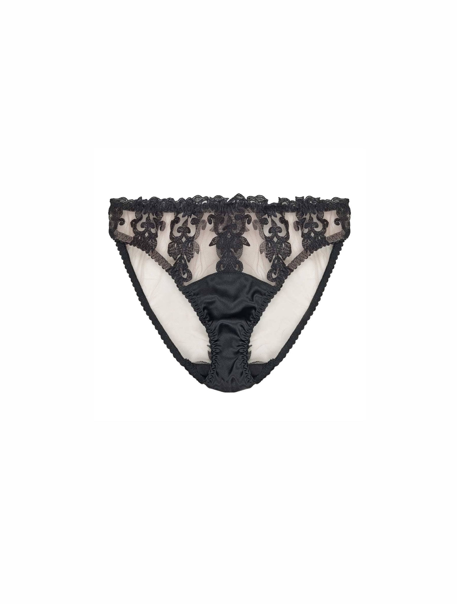 Our classic brief silhouette is crafted in bold Onyx embroidery and sheer Italian tulle for a play on transparency and sensuality. Crafted in Portugal, this black brief features hand-drawn embroidery, designed by Founder Fleur, and is paired with sumptuous black silk for a luxurious feel. The back of this bikini brief features a cheeky embroidery motif placement whilst the soft Italian tulle melts away revealing the skin underneath.