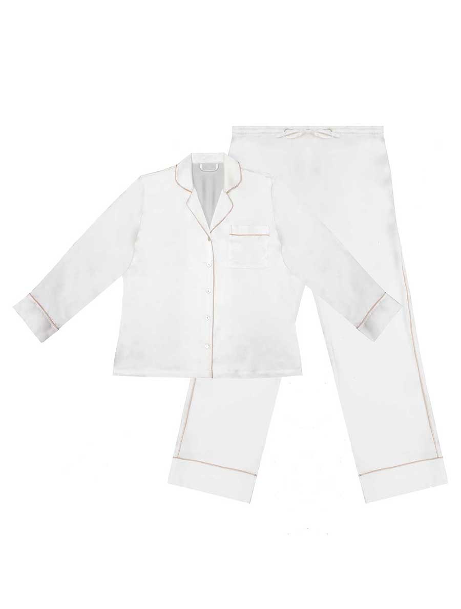 Our classic ivory pyjama set is crafted using the finest silk chosen for its weight, drape and softness. With soft blush piping in timeless styles, this is luxury lounging at its very finest.