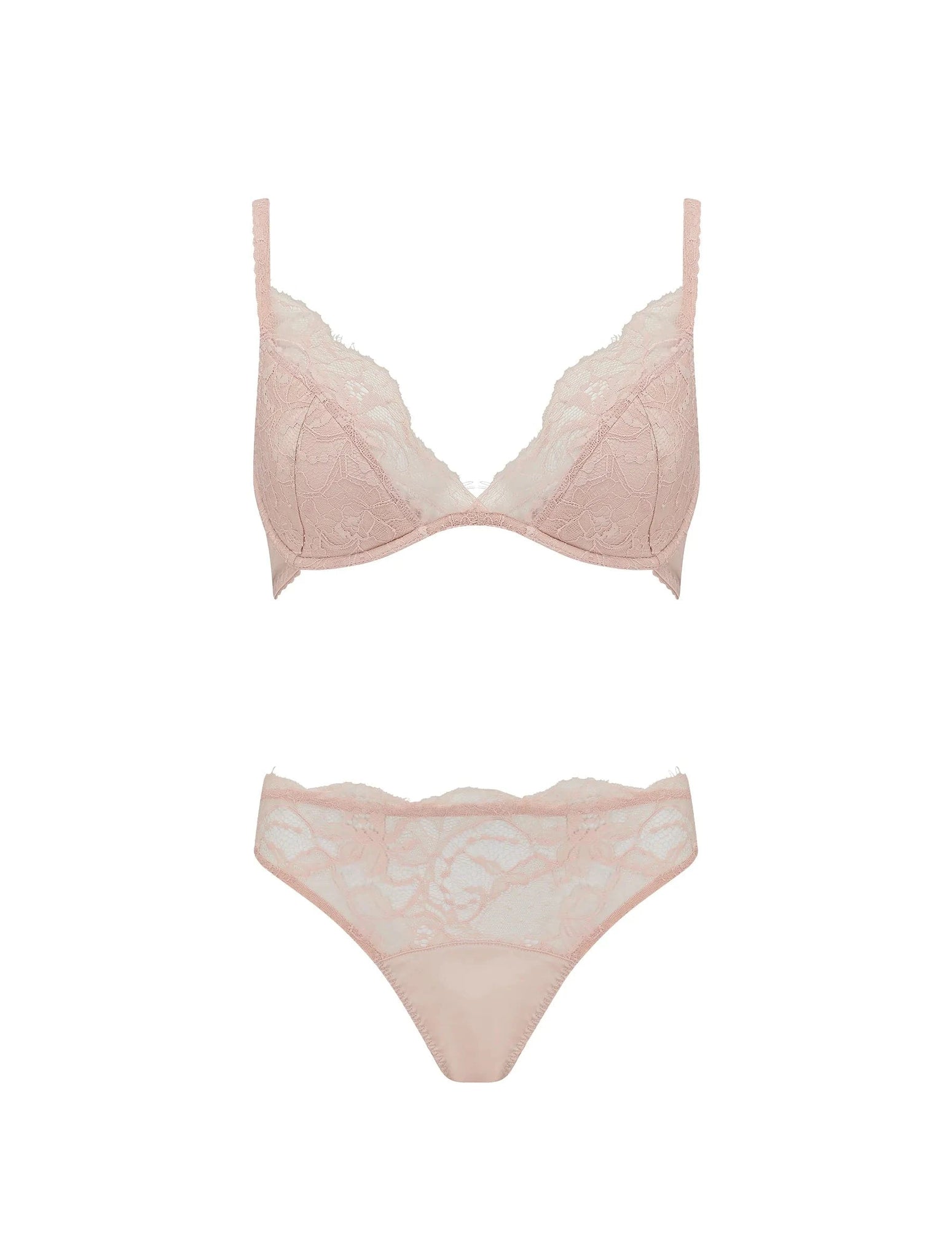 Expert craftsmanship is combined with timeless lingerie design with the signature padded plunge bra and brief lingerie set in blush. This ultra feminine set is crafted in Portugal using the finest French lace and silk in a romantic shade of blush pink. The full set features our lightly padded plunge bra with silk lined cups, and our delicate everyday lace brief.