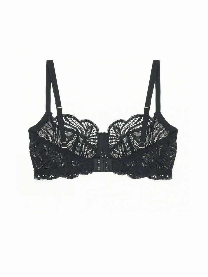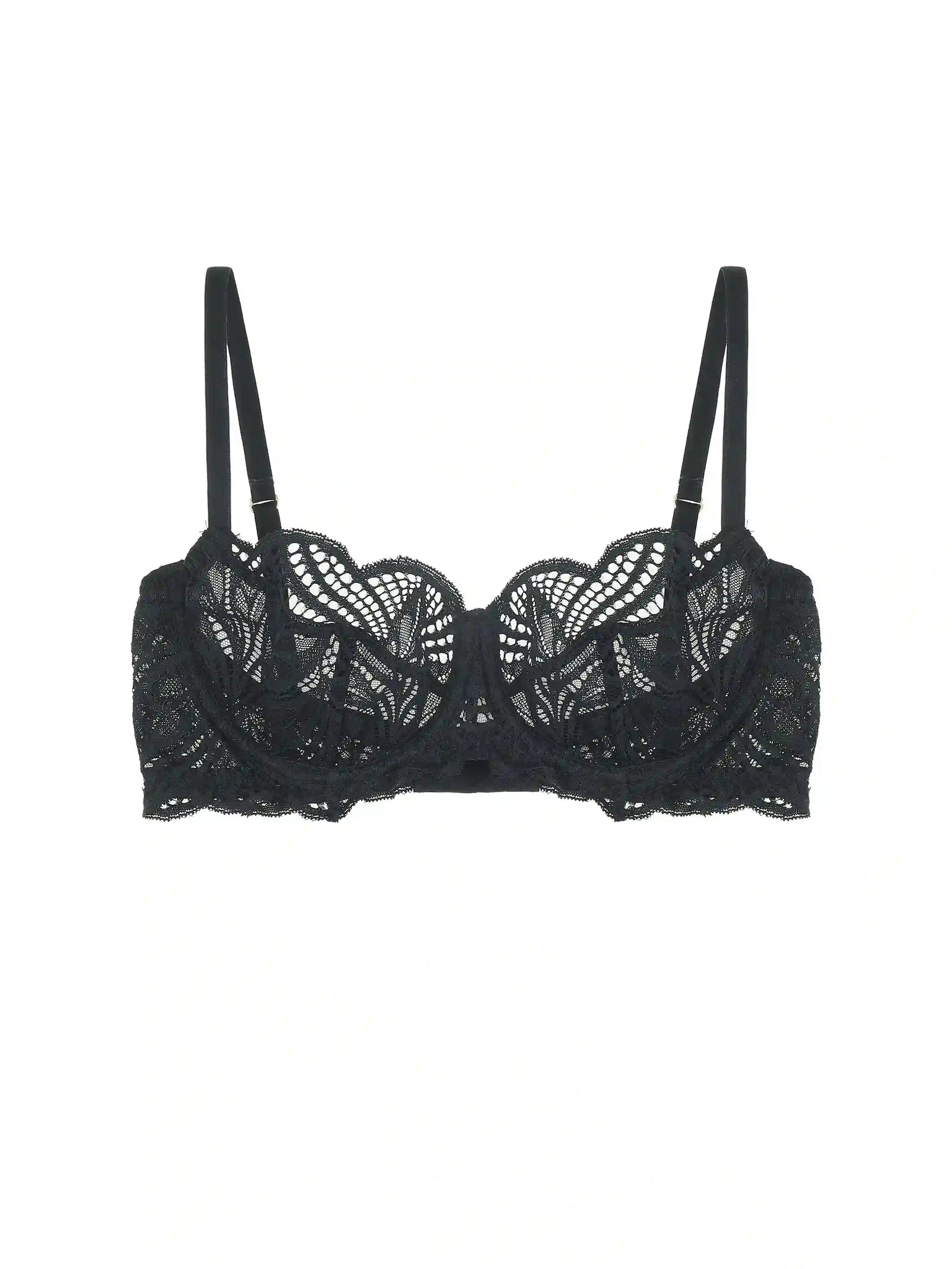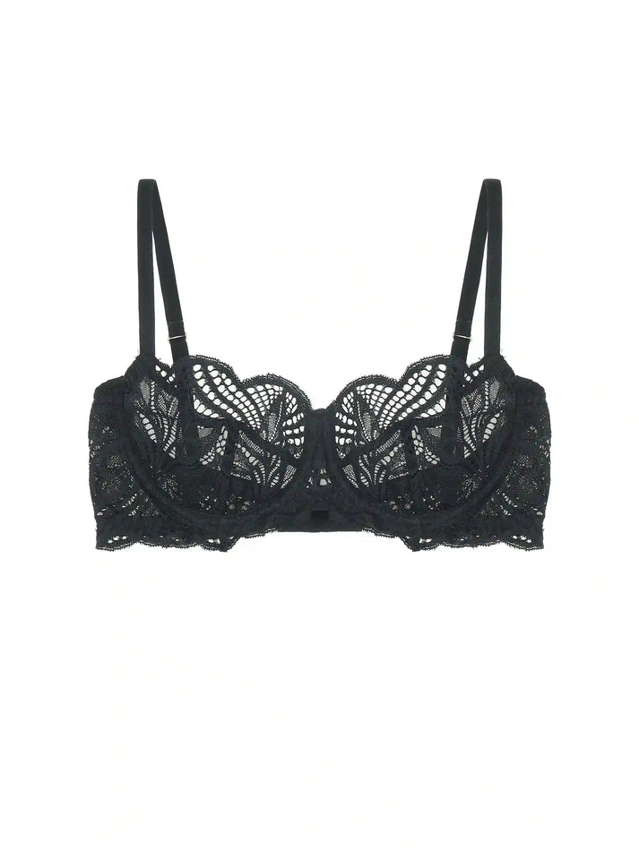 Der klassische Fleur Of England Balconette-BH wurde für die Deilen-Kollektion in schwarzer Spitze neu interpretiert und aus nachhaltigen Materialien gefertigt. Diese weiche Spitze bietet bequemen Halt, umschmeichelt die Körbchen und verziert sie mit einem zarten Blättermuster.