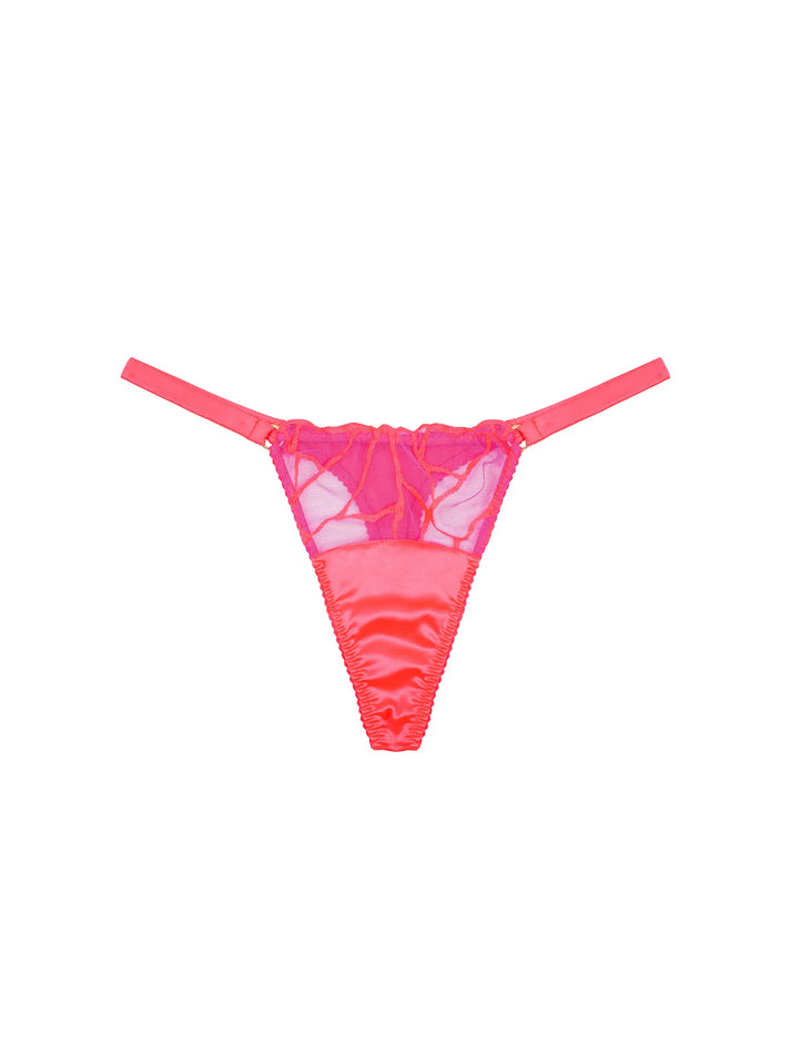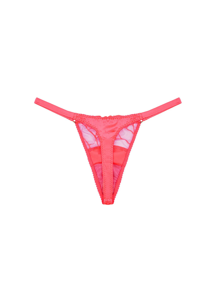 Der meistverkaufte String ist diese Saison wieder da – neu interpretiert in Cleos leuchtendem Korall. Hergestellt aus recyceltem, weichem Tüll mit aufwendiger Stickerei. Der Zwickel ist für mehr Komfort mit Baumwolle gefüttert, mit einem weichen Seideneinsatz auf der Vorderseite und 24-karätig vergoldeten Ringen.