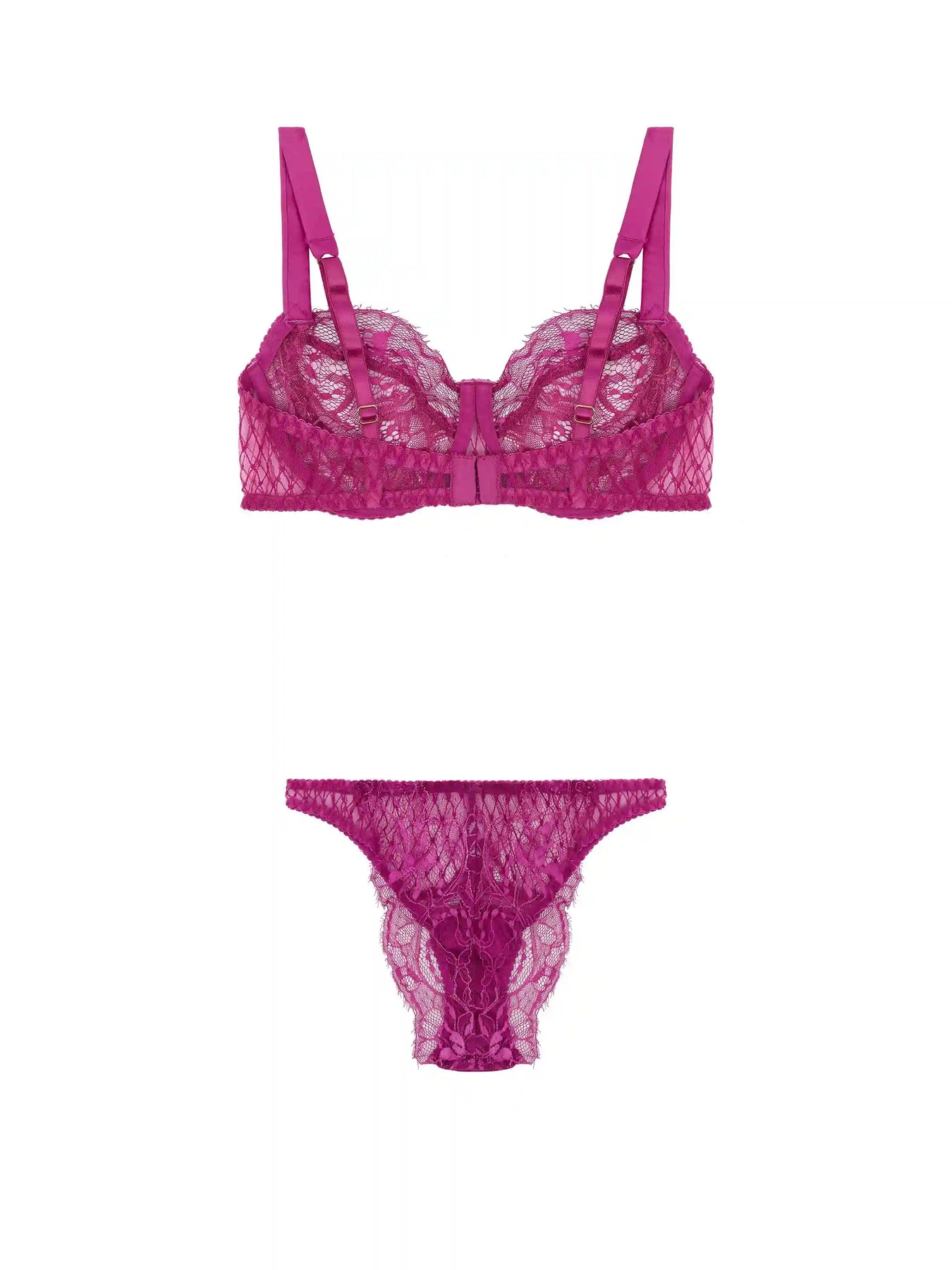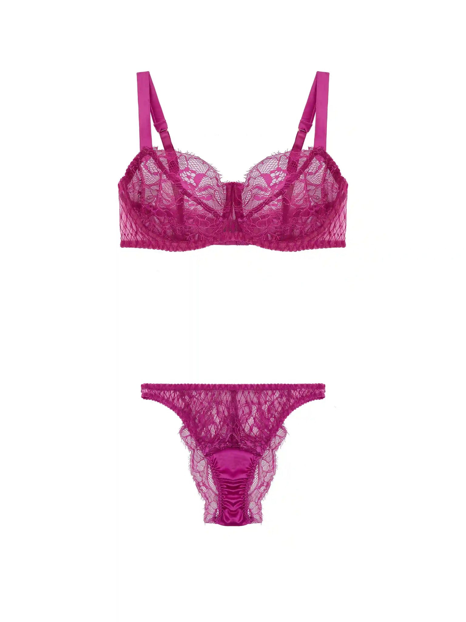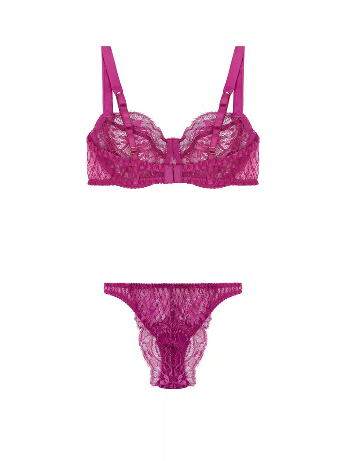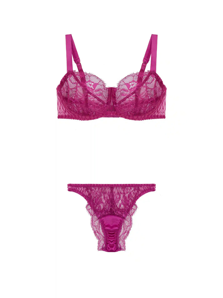 Featuring our Bestselling Balcony bra, with lace cups and embroidered wing, and the bestselling lace Brazilian Brief, crafted in the sensual fuchsia pink of the Paloma collection. Soft silk and lace are paired with bespoke embroidery featuring hidden heart details and are finished with 24K Gold-plated hardware for a sophisticated lingerie look that fits as exceptional as it looks.