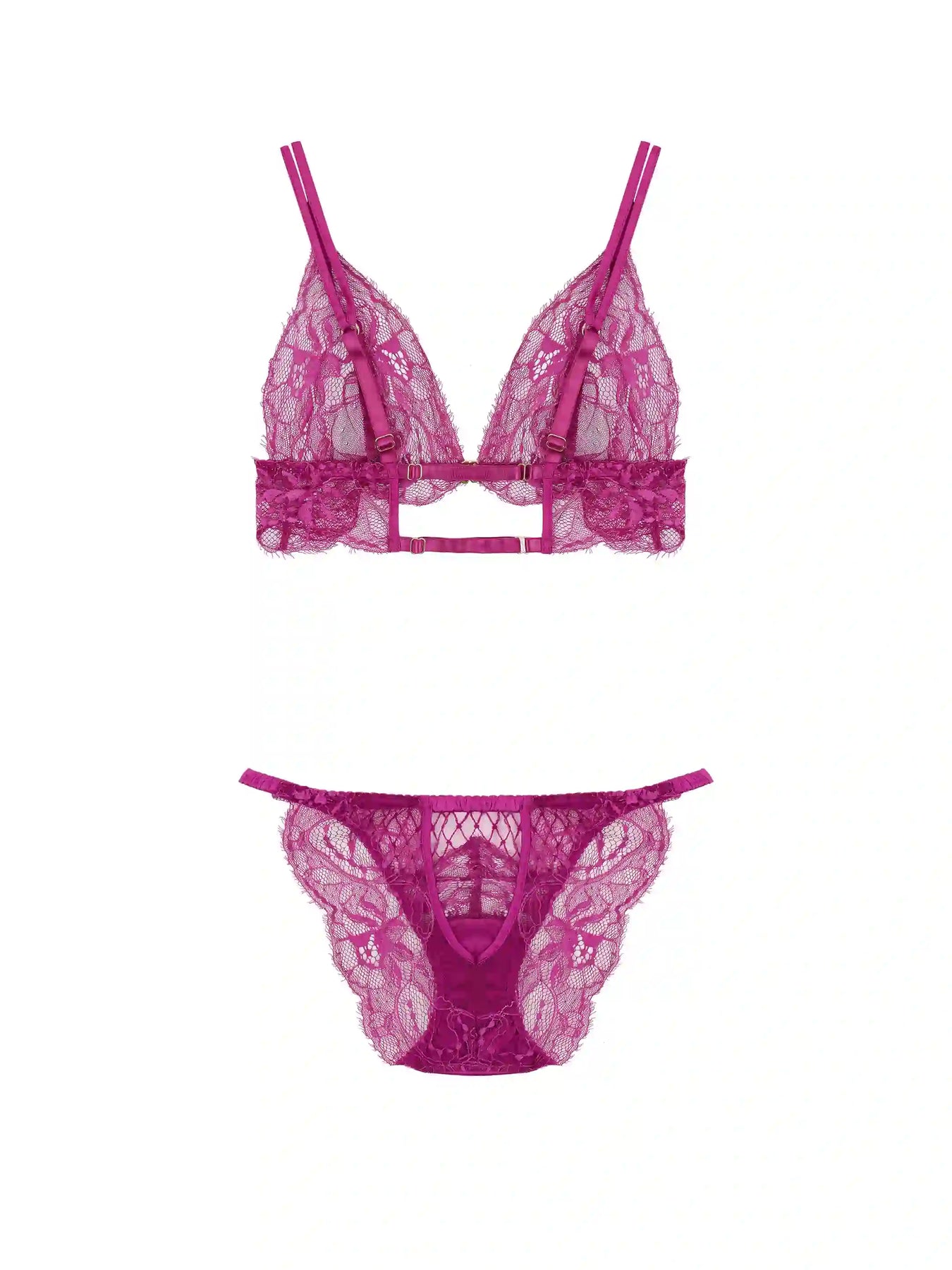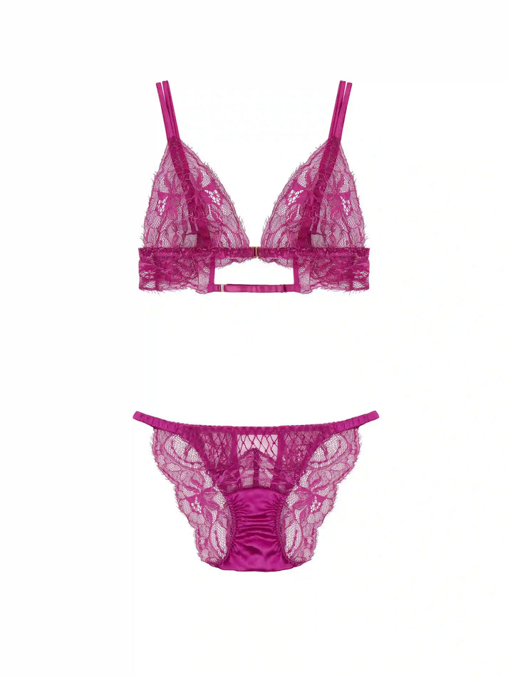 This luxury lingerie set features our beloved non-wired triangle bra with front fastening detail, and our sensual lace open back Ouvert, brief. Crafted from our Signature French lace, bespoke embroidery with hidden heart detail and luxurious silk, this lingerie set is elegantly finished with 24K gold-plated details.