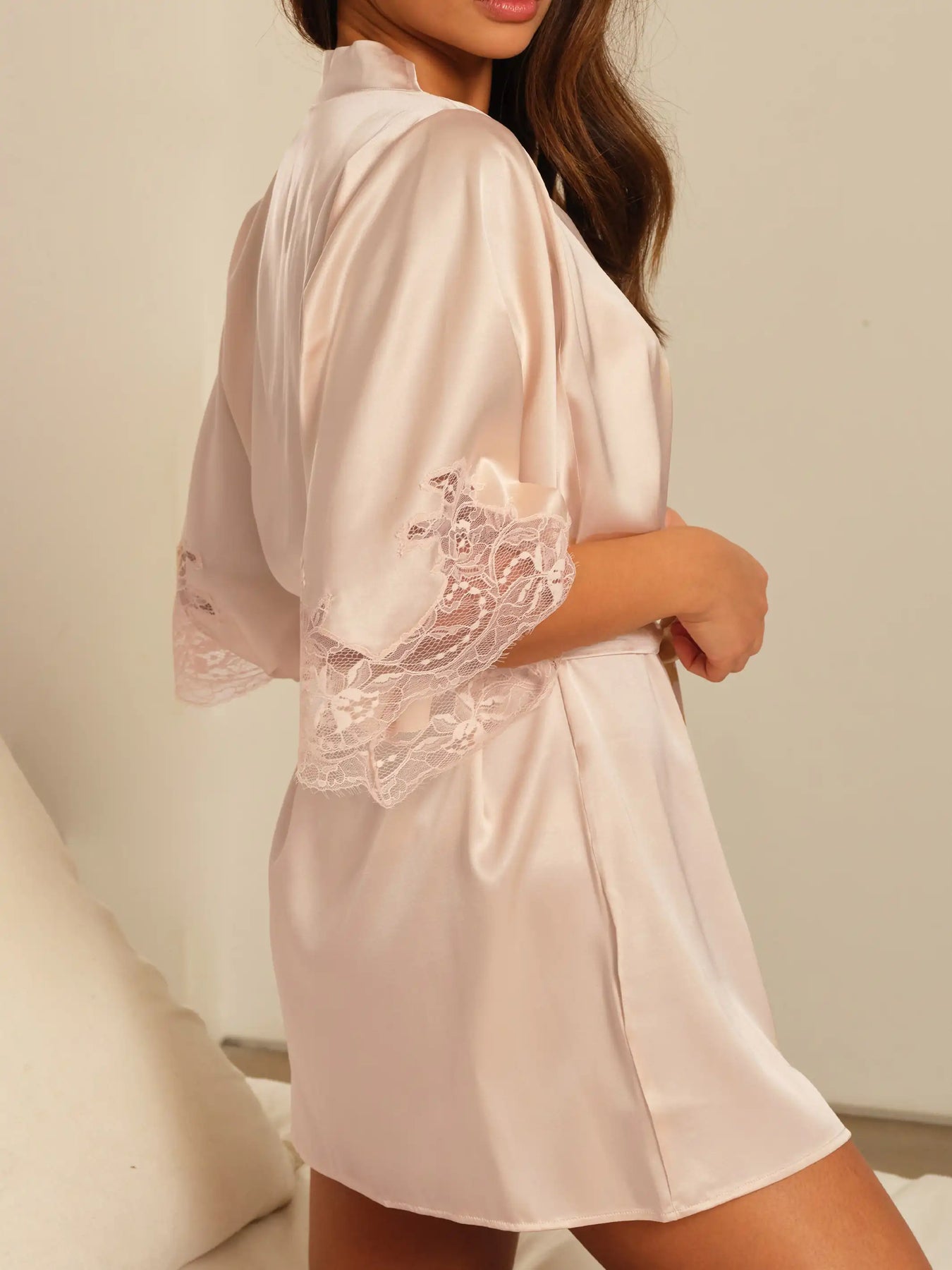 Unser klassischer Morgenmantel ist ein zeitloses Stück, das nie aus der Mode kommt. Dieses luxuriöse Stück aus weichem, blassrosa Seidensatin mit handgeschnittenen Spitzenärmeln ist sowohl sinnlich als auch schmeichelhaft.