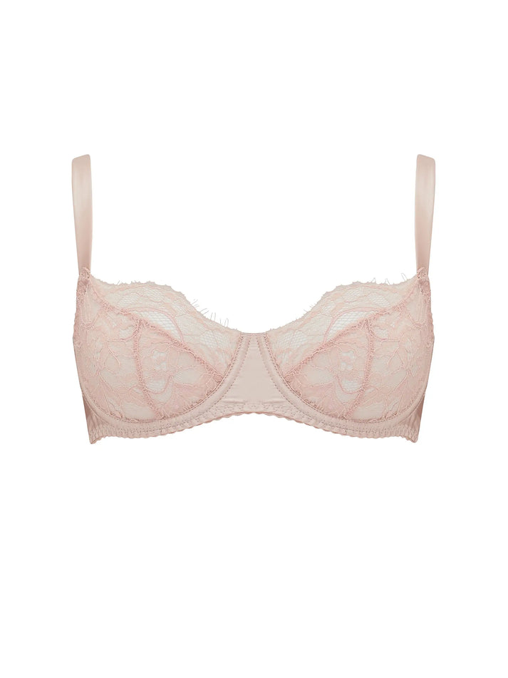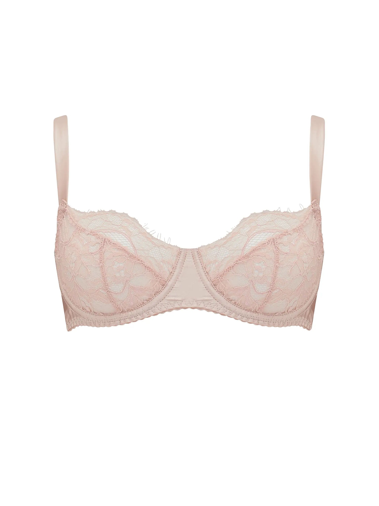 The Signature Blush lace balcony bra is a must-have style for any lingerie connoisseur. Crafted in delicate pale pink silk satin with delicate lace underwired cups, it is the perfect choice for larger bust sizes, offering support and uplift.