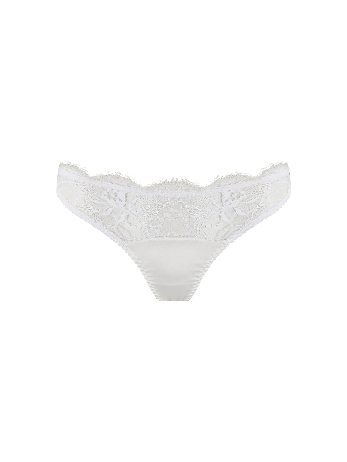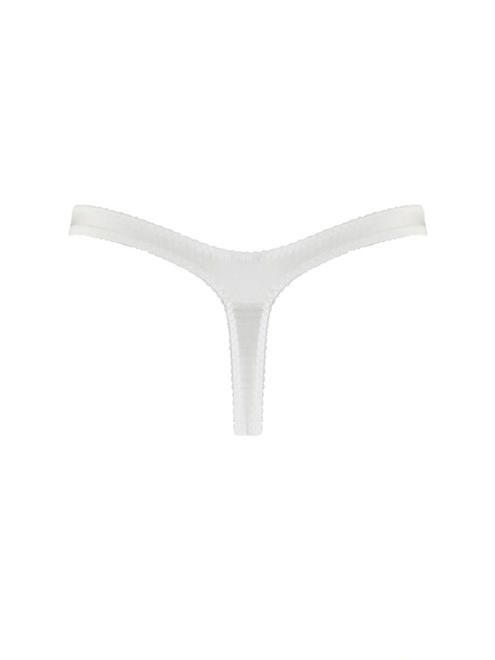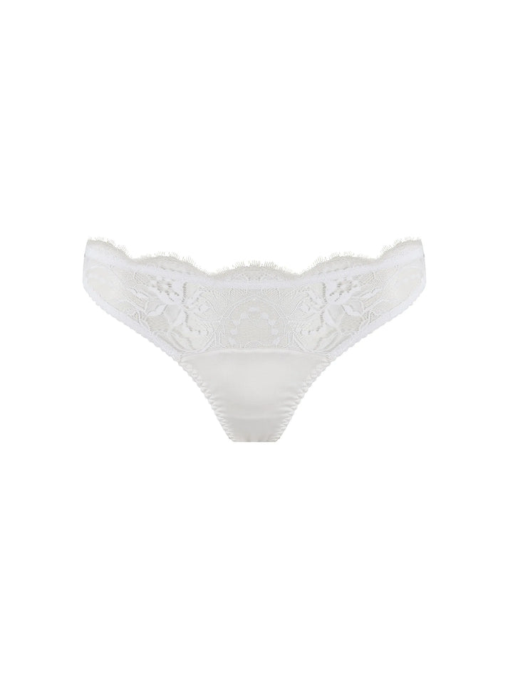 Make every day elegant with the Signature White thong. Crafted in luxurious white silk with a front panel of delicate white French eyelash lace, the thong is designed to sit on your mid-rise, making it as flattering and practical as it is beautiful.