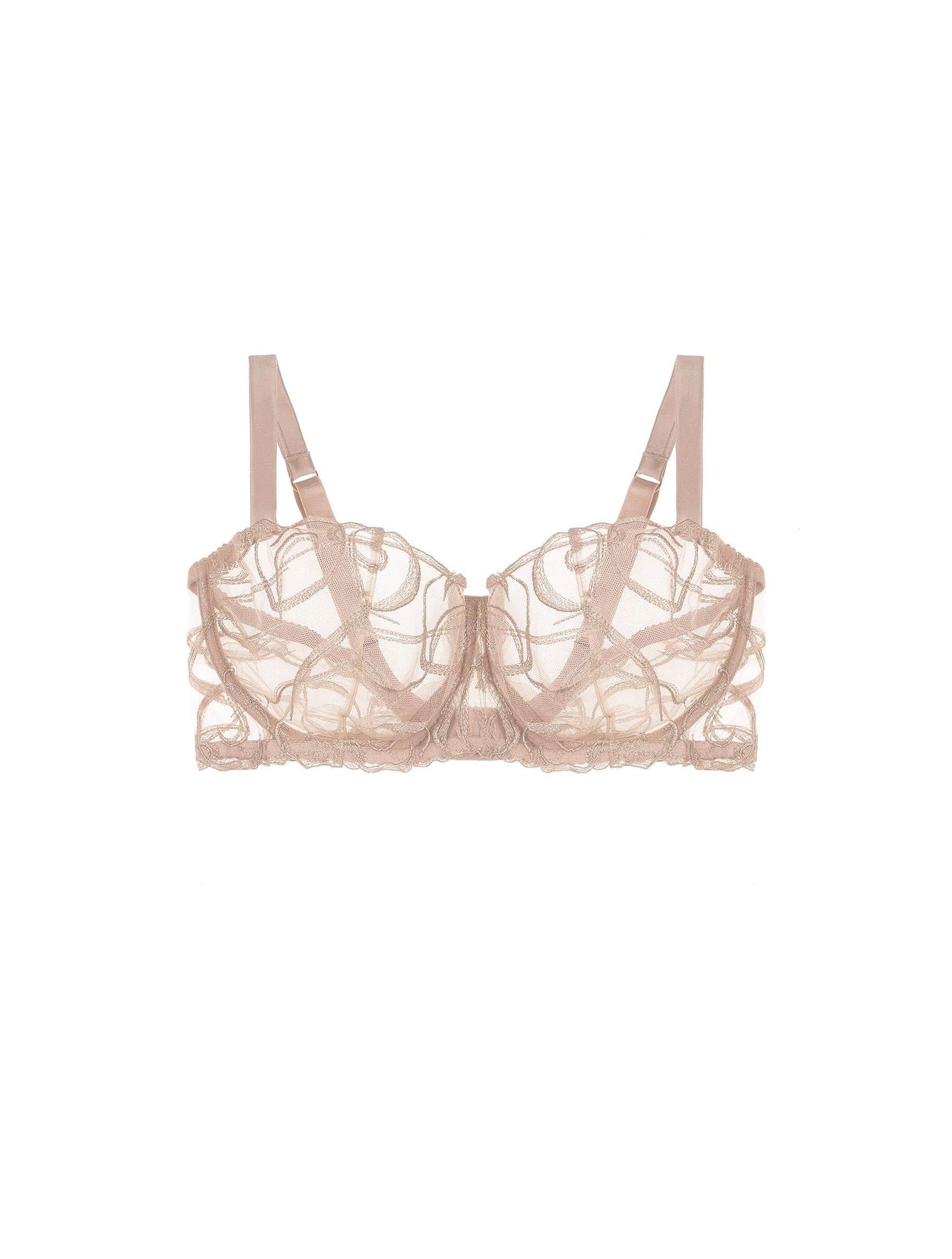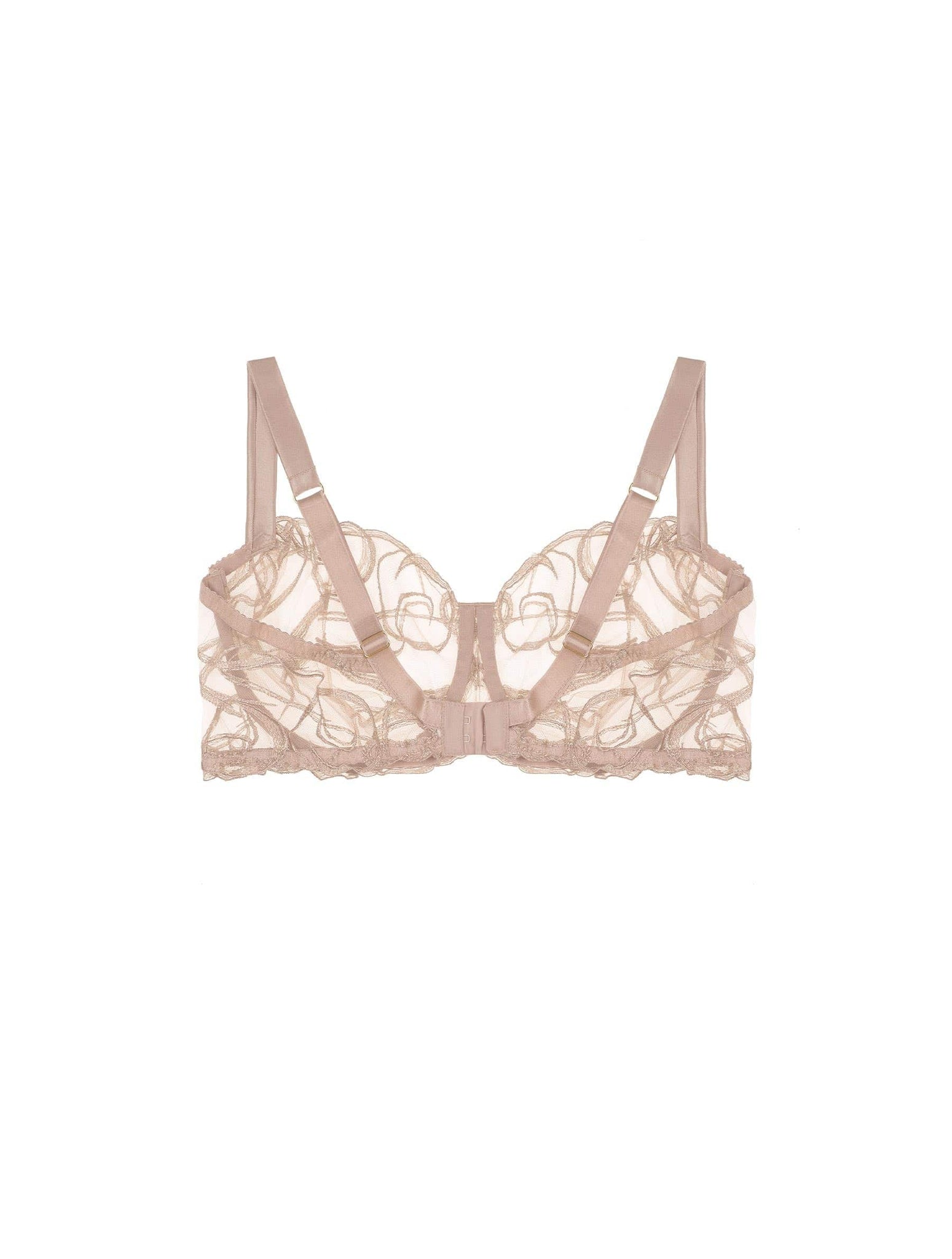 The Mia Curve Balcony Bra does not comprise on design, bespoke hand-drawn embroidery delicately applied to sheer Italian tulle allows a peep through to the skin. A U-Back design to the back and thicker silk-encased straps offer comfortable support for the wearer. Finished in a balmy shade of gold, with 24-carat gold plated hardware this piece is every bit elegant and luxurious.