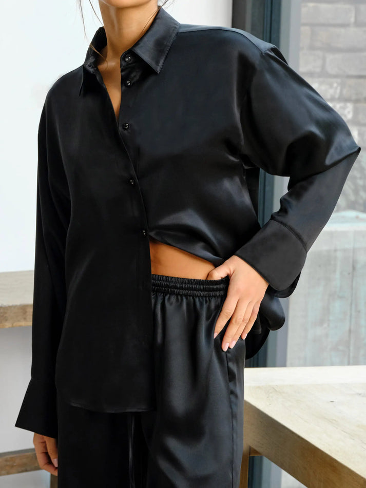 Introducing the effortlessly luxurious Fleur du Jour pyjama set in Black. Crafted in 100% silk this pyjama set is as chic as it is opulent. The set features a long sleeve, button through shirt with elegant, shaped cuffs and full length trousers with silk lined pockets. Designed to be worn day to night, every element of this luxurious set has been meticulously considered, from the silk covered buttons, to the French seams and silk lining, providing a luxury unmatched.