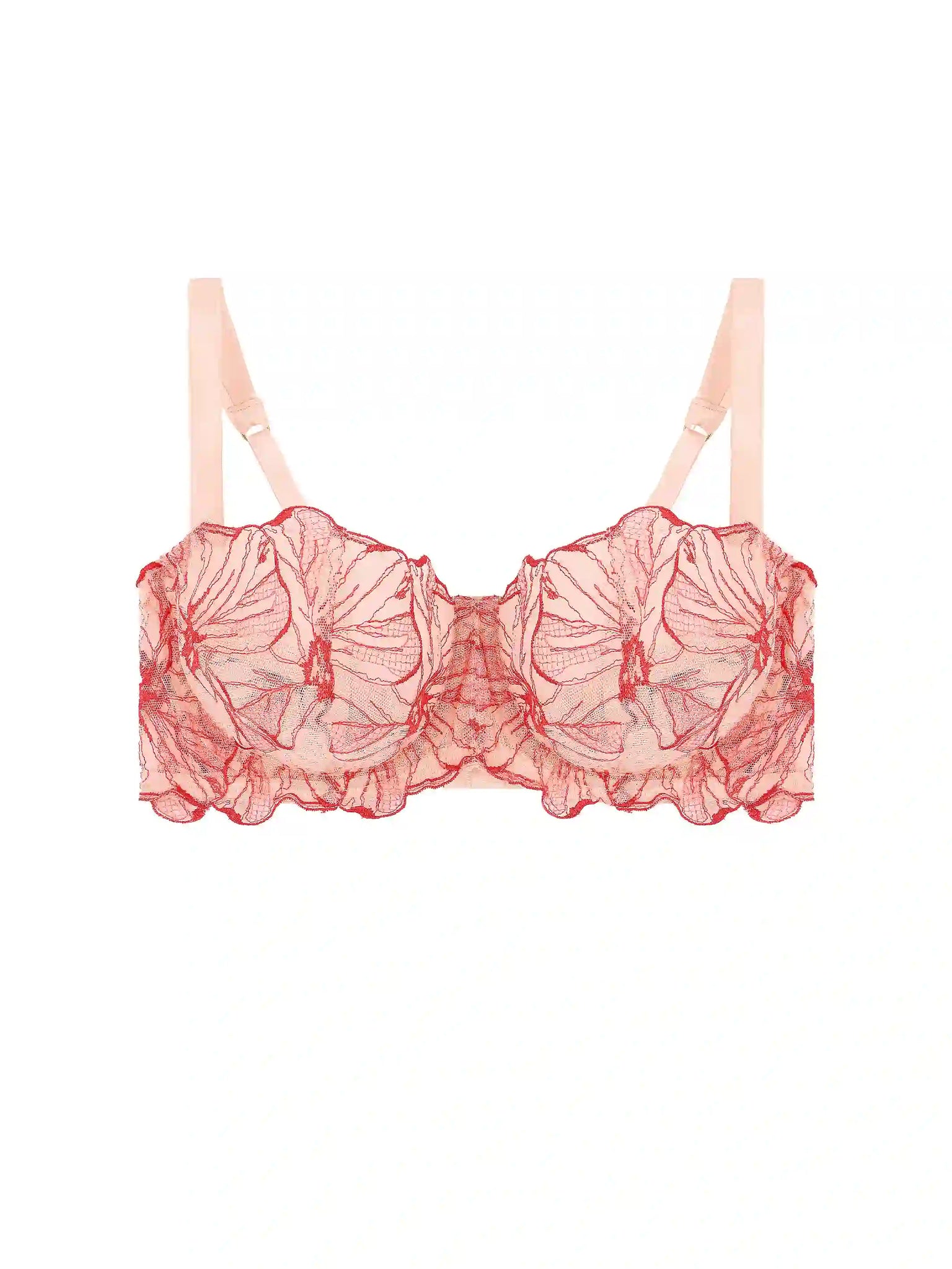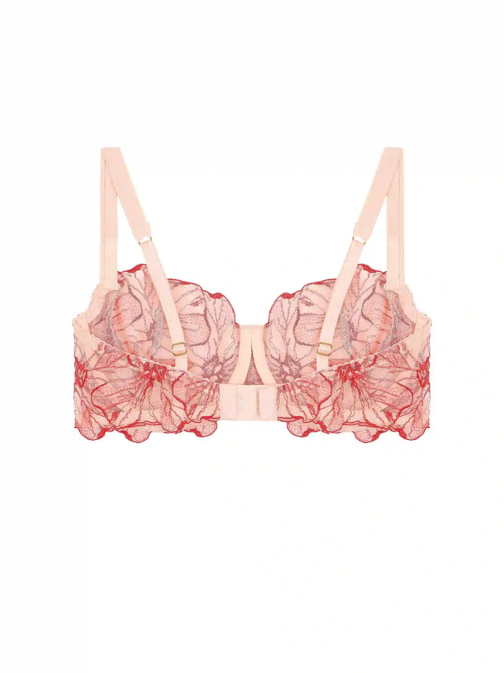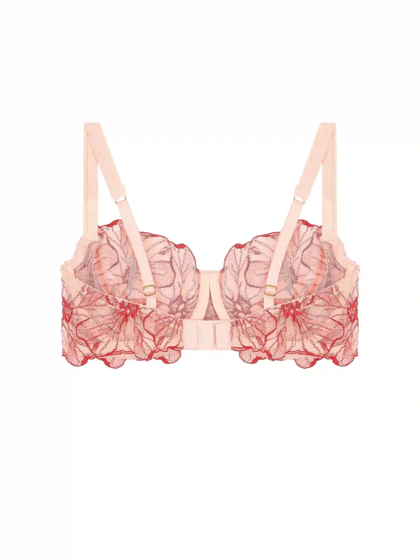 Indulge in the beauty of the limited edition Rosa collection with the bestselling Balcony Bra. This luxury bra is designed to accentuate the bust whilst offering good coverage. The elegant petal edge of the bespoke embroidery design beautifully frames the bust and continues around the body of the bra. Silk straps are combined with 24 carat gold plated hardware for a subtle sparkle against the romantic pink hues. Available in sizes 30D-36DD, the cups are lined with soft tulle, for ultimate comfort and support.