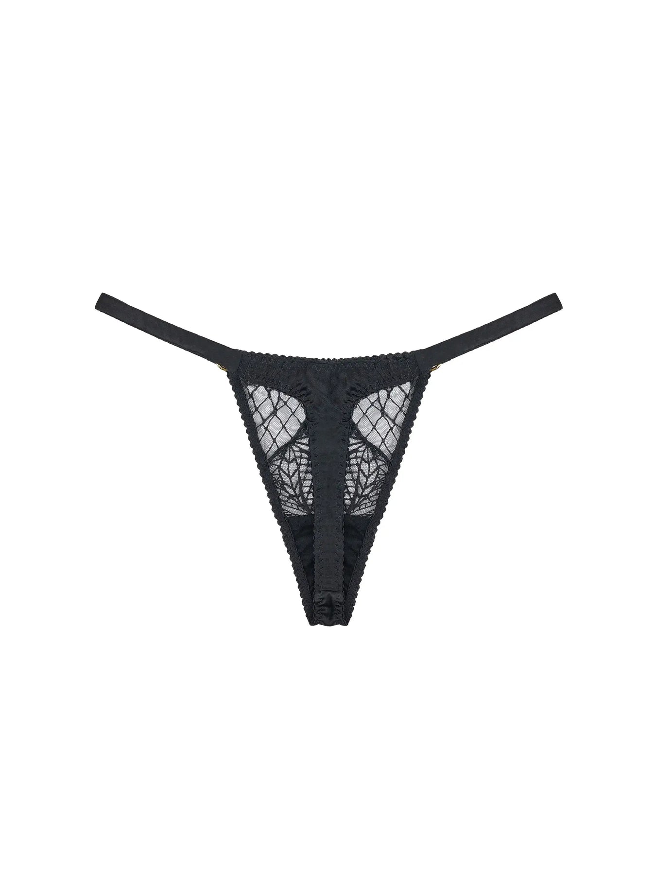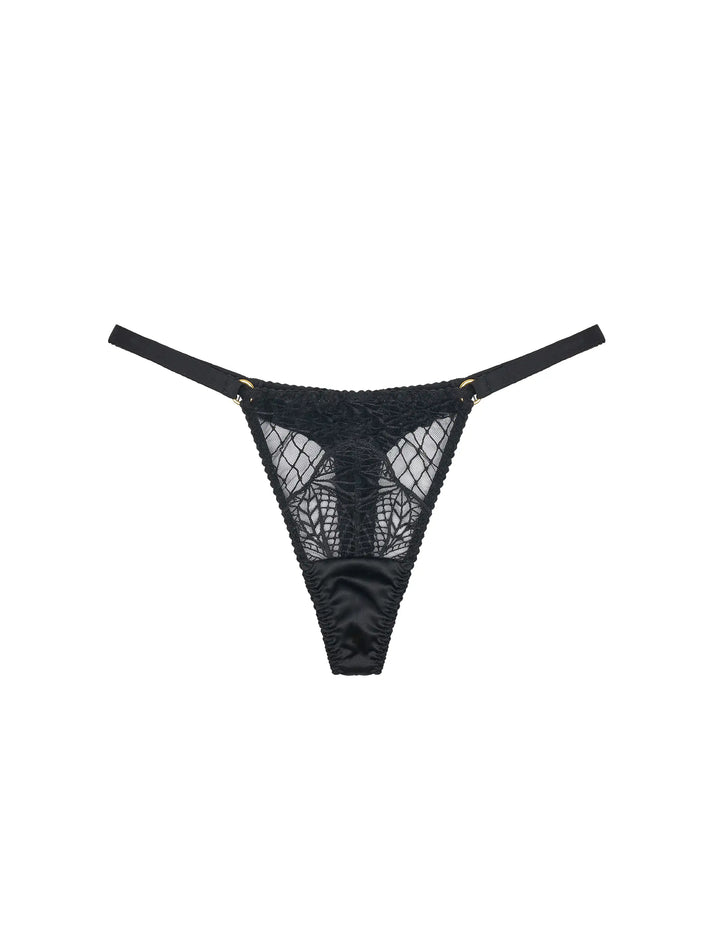 The Roxy collection is inspired by female confidence and strength, and the Roxy silk thong is no exception. Fleur of England's bestselling, high-leg thong silhouette is updated for the new season with sensual hand-drawn embroidery, designed by founder Fleur. The front of the garment features a mix of bespoke embroidery, paired with sensual Black silk, and 24-carat gold plated rings, for an opulent feel. The delicate side straps are crafted using elastic, encased in silk not only for a comfortable feel but also for a smooth silhouette. The back of the garment is crafted entirely from silk.