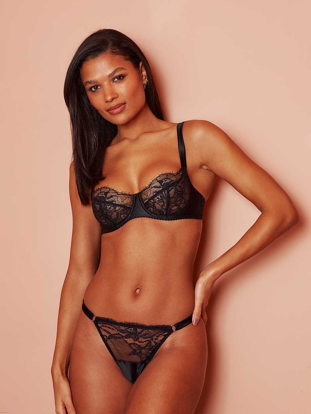 Our Signature every day set. Introducing the Signature Balcony bra and silk strap thong lingerie set, where modern elegance meets timeless design. The complete set includes our bestselling lace balcony bra, designed for gentle uplift and a flawless shape, paired with the matching silk strap thong, irresistibly comfortable and effortlessly chic. Crafted by our friends in Portugal, this must have set is crafted using the finest French eyelash lace and most luxurious silk satin.