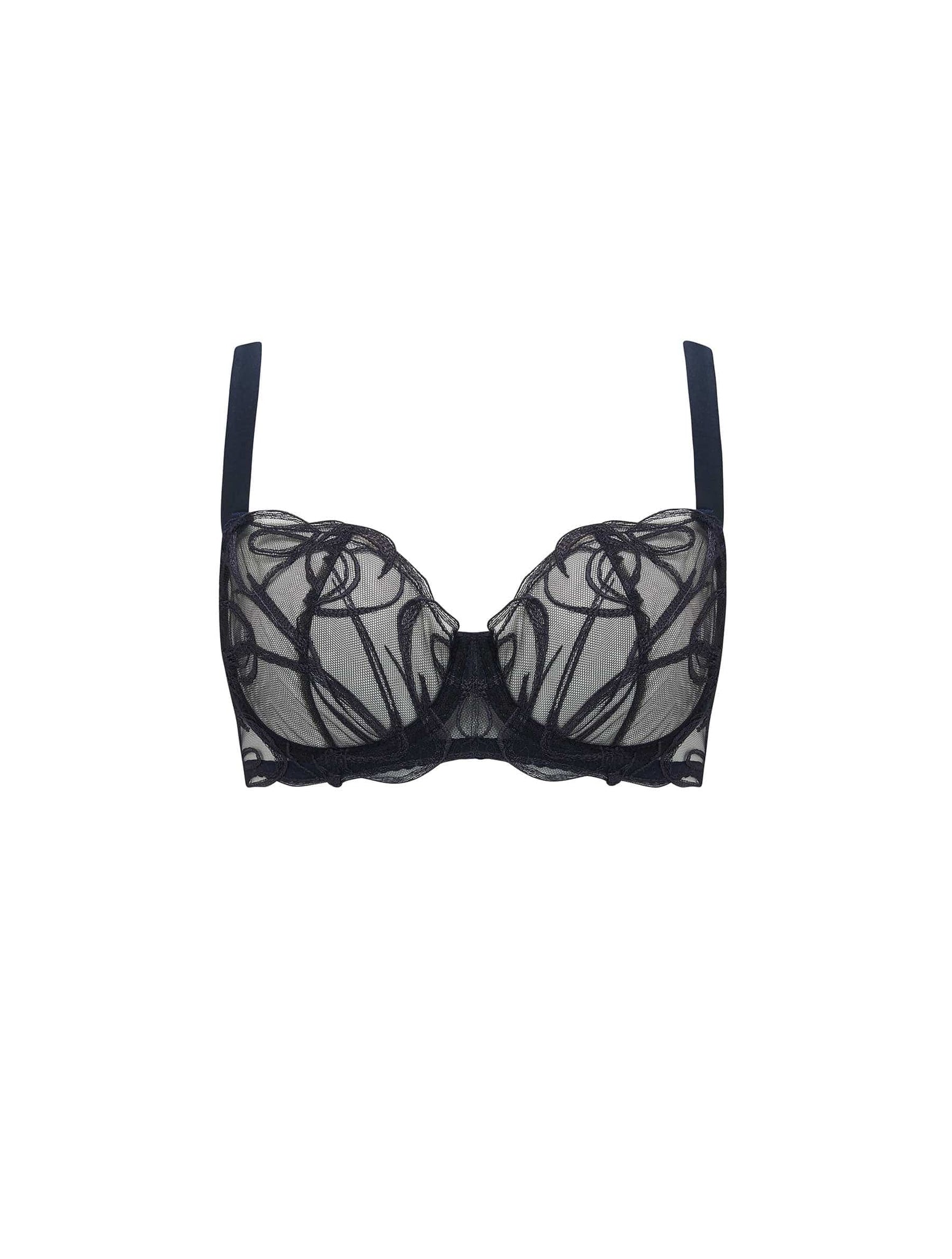 The Fridar Balcony Bra is a sensuous lingerie piece crafted in deep midnight blue. The sheer bra features effortless brush strokes embroidered across the cups. Soft silk encased straps sit boldly on the shoulders, providing support and comfort along with a flattering uplift.