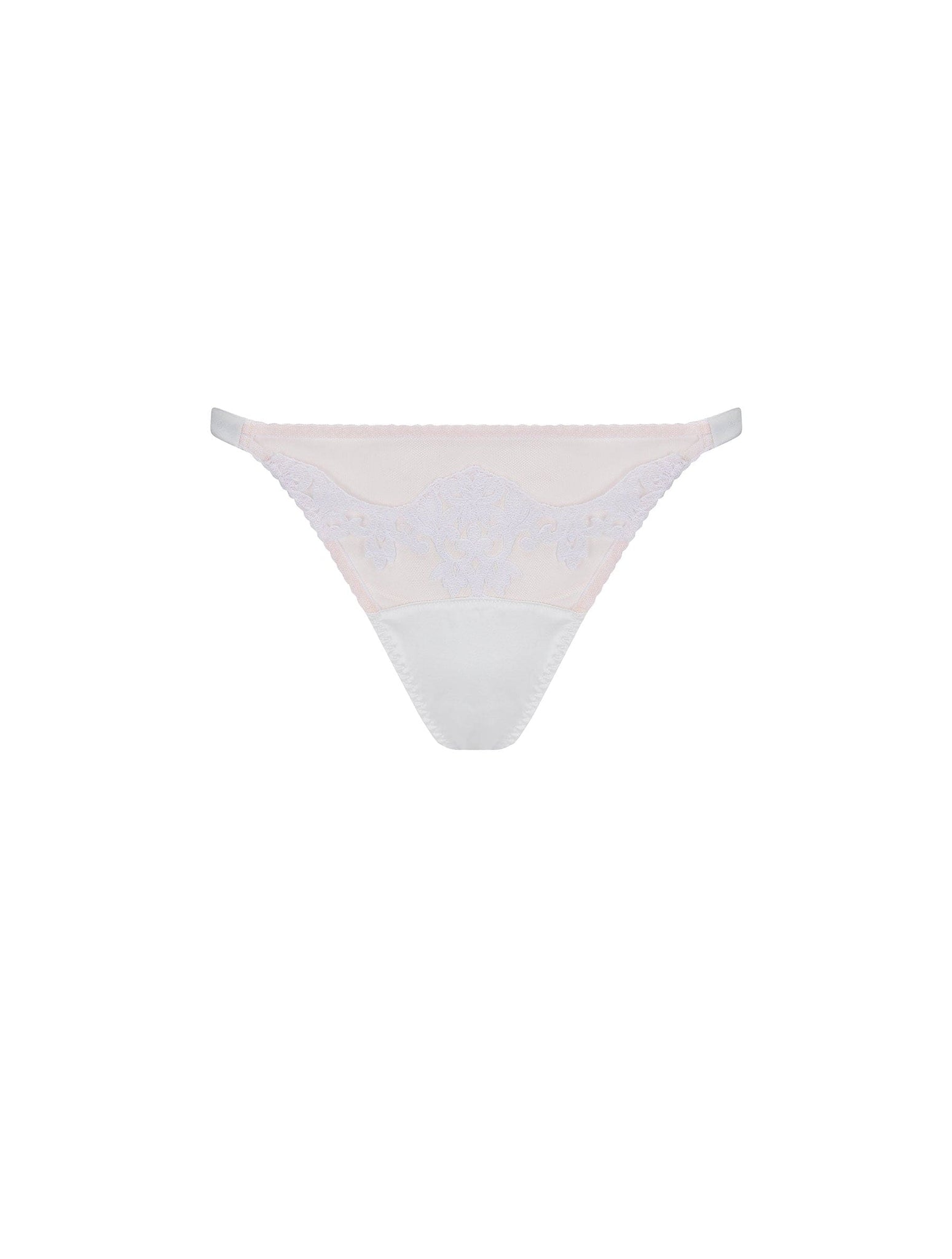 This playful piece is a perfect addition to a luxury lingerie set. Bespoke embroidery features on sheer Italian tulle and frames the revealing opening at the back of the brief. Luxury silk straps hug the hips, pulling the sheer tulle against the body to reveal the skin beneath for a daring look.