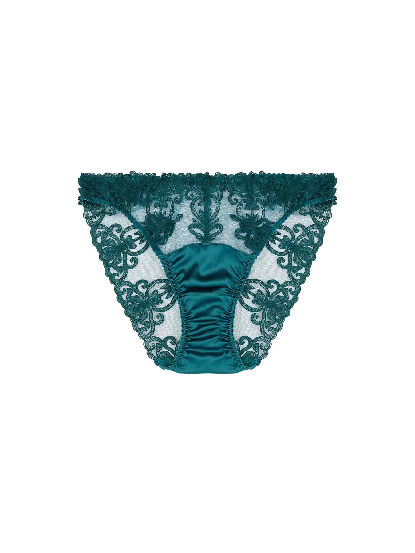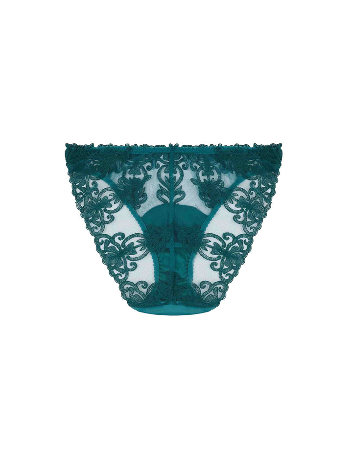 A refined bestselling style, this luxury brief balances opulence with everyday comfort and wearability. The flattering mid-rise silhouette is elegant with good coverage and combines sheer tulle and embroidery with a luxurious front silk panel in an irresistible shade of peacock green.