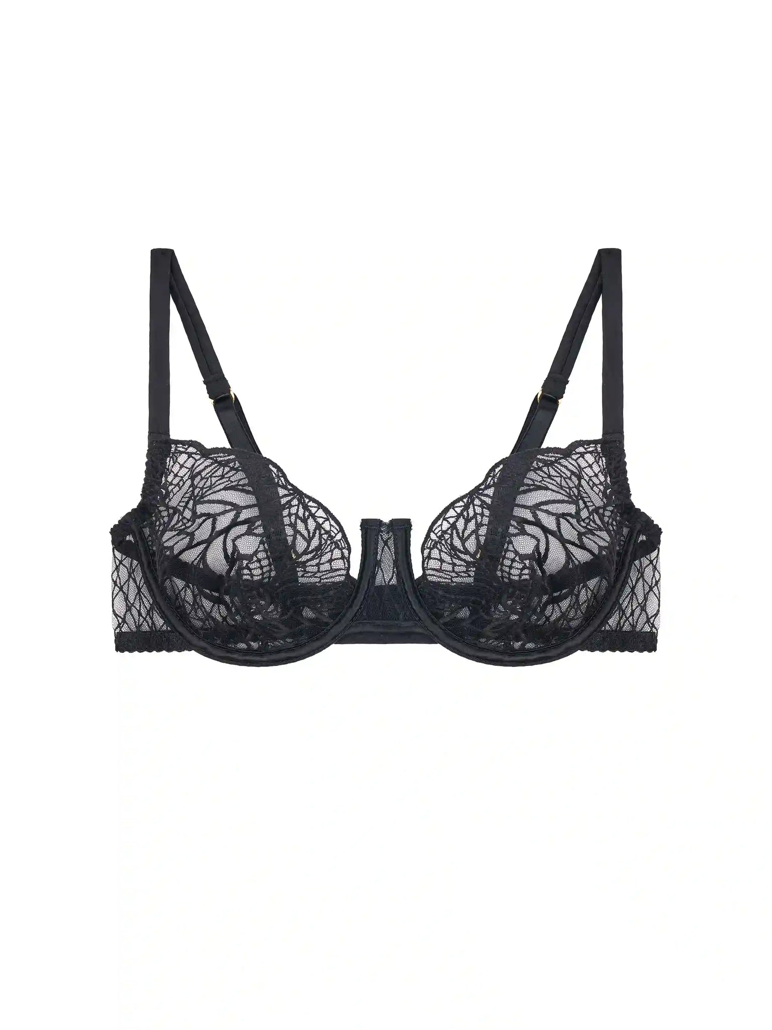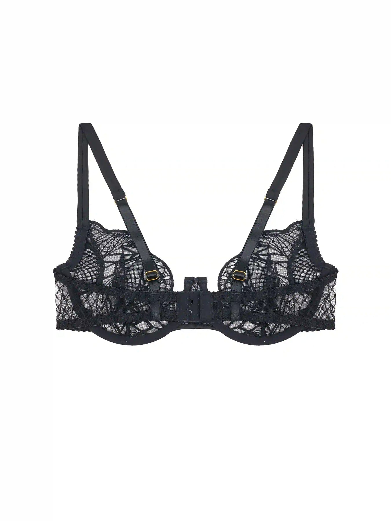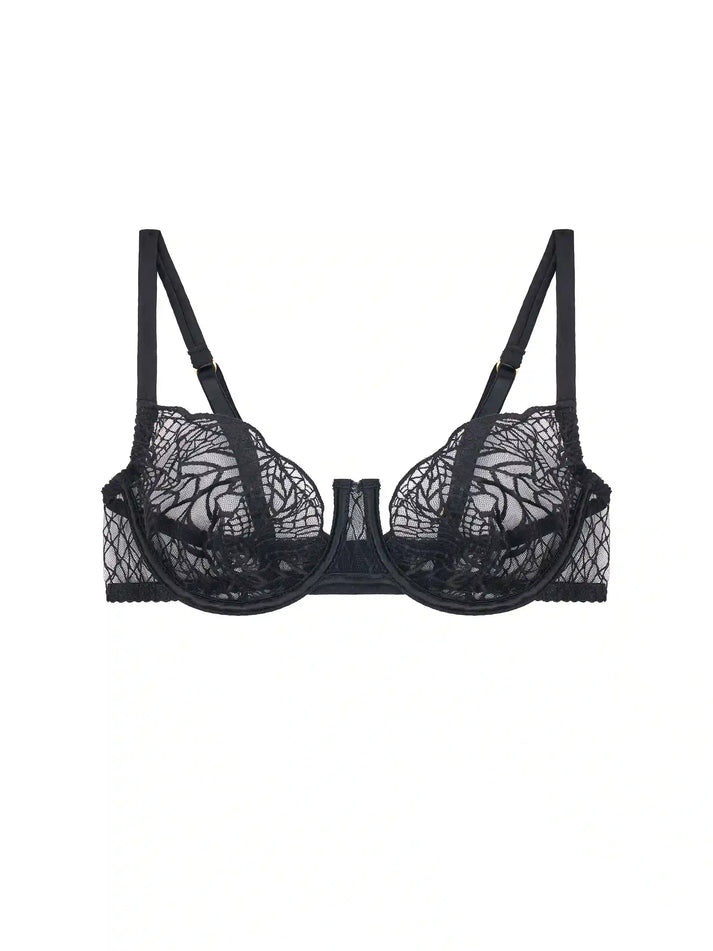 Complément sensuel de la collection Roxy, le soutien-gorge Roxy Demi attire tous les regards. Son décolleté plongeant spectaculaire offre une couverture plus discrète que nos soutiens-gorge à armatures classiques, créant une silhouette séduisante. Disponible du 85D au 95D, ce soutien-gorge arbore un mélange de broderies sur mesure, dessinées à la main, sur un tulle italien doux, imaginé par la fondatrice Fleur. Ce soutien-gorge noir brodé capte tous les regards, sublime vos courbes et incarne l'énergie féminine. Enfin, des finitions plaquées or 24 carats ornent les bretelles en soie pour une touche de luxe supplémentaire.