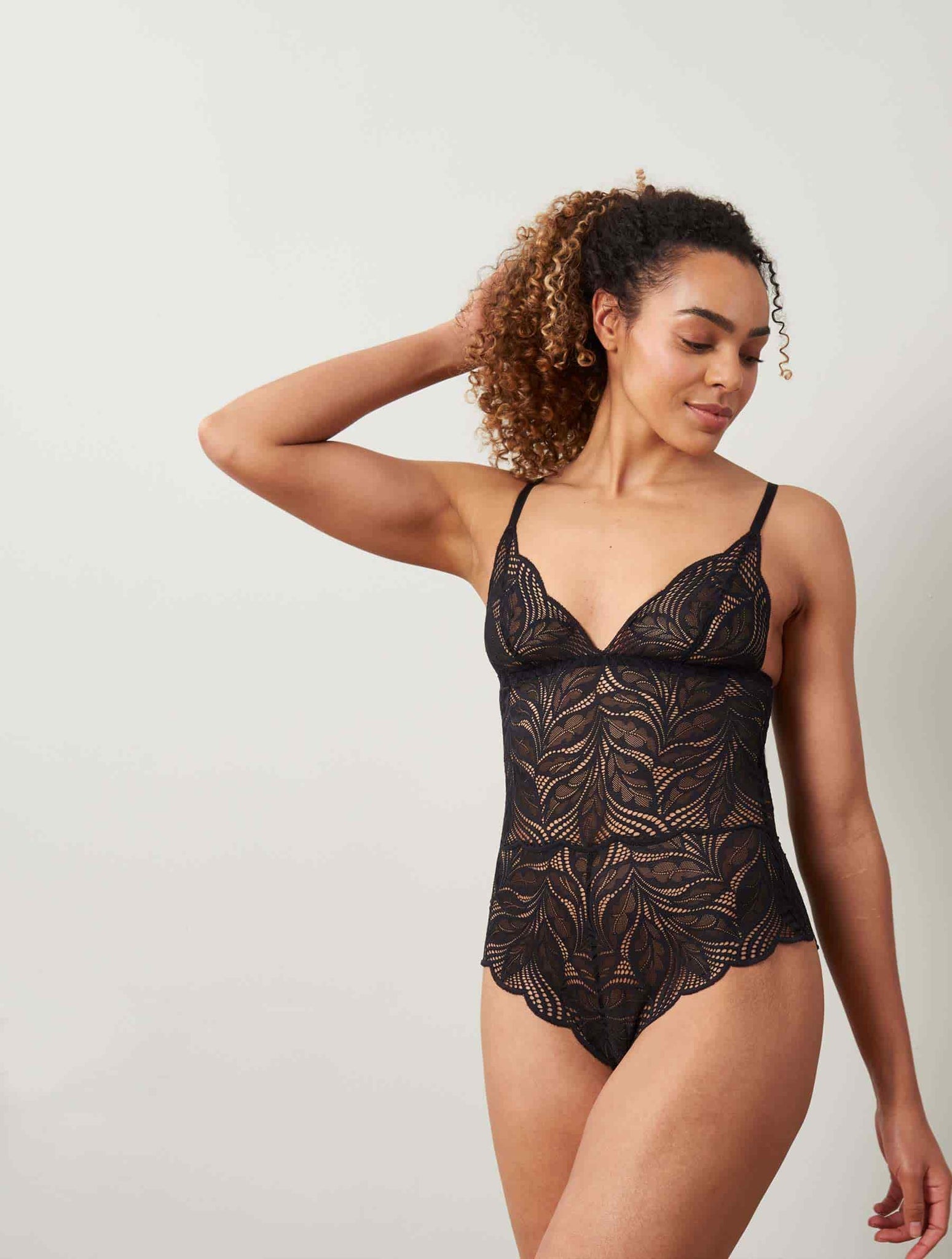 Quelle collection de lingerie de luxe serait complète sans une pièce exceptionnelle ? Le body Deilen respire le charme et le savoir-faire britannique, soigneusement conçu pour une coupe qui sublime chaque courbe. Sa magnifique dentelle extensible noire à motif de feuilles s'enroule naturellement autour de ce body sans armatures, créant un look saisissant sans compromettre le confort. Fermeture par agrafe réglable et dos nu.