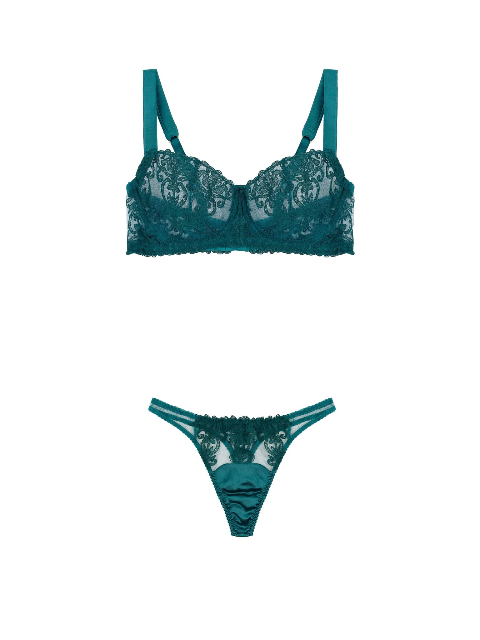 Elevate your everyday with the Olivia Balcony bra and Embroidered thong luxury lingerie set. Crafted in a heritage peacock green and featuring 24k gold-plated hardware for an extra touch of luxury. The sides of the thong are Italian tulle and offer more stretch than our ‘silk strap’ thongs, adding to the wearer's comfort.