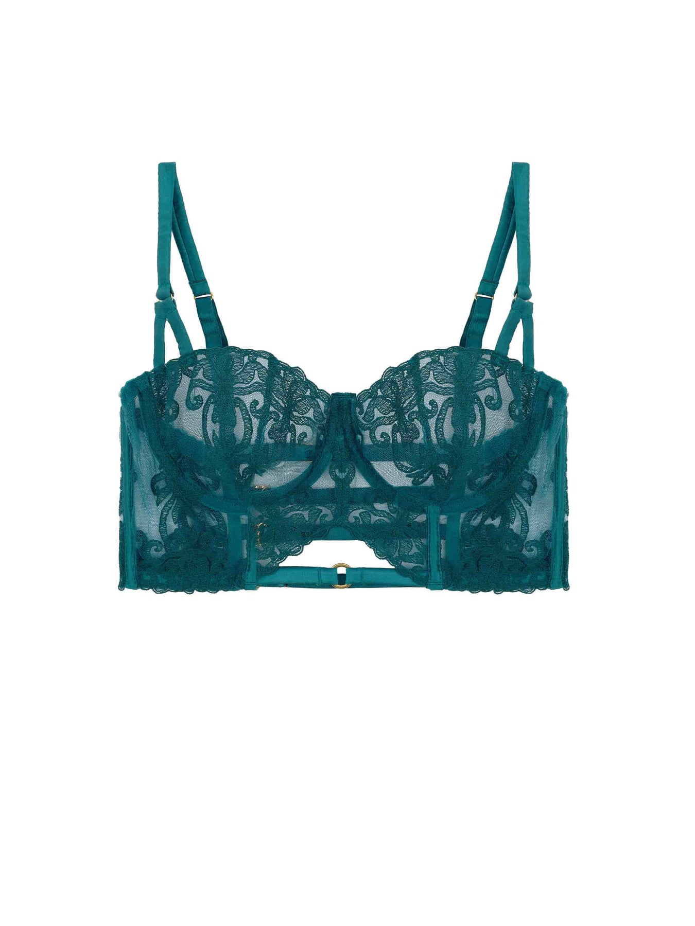 A statement luxury lingerie piece that is both ultra-feminine and boldly captivating. This structured underwired longline Balcony bra combines soft tulle and ornate embroidery in peacock green with a sensual adjustable back design fastened with gold-plated hooks, silk strap details and an eye-catching cut-out front with gold plated ring.