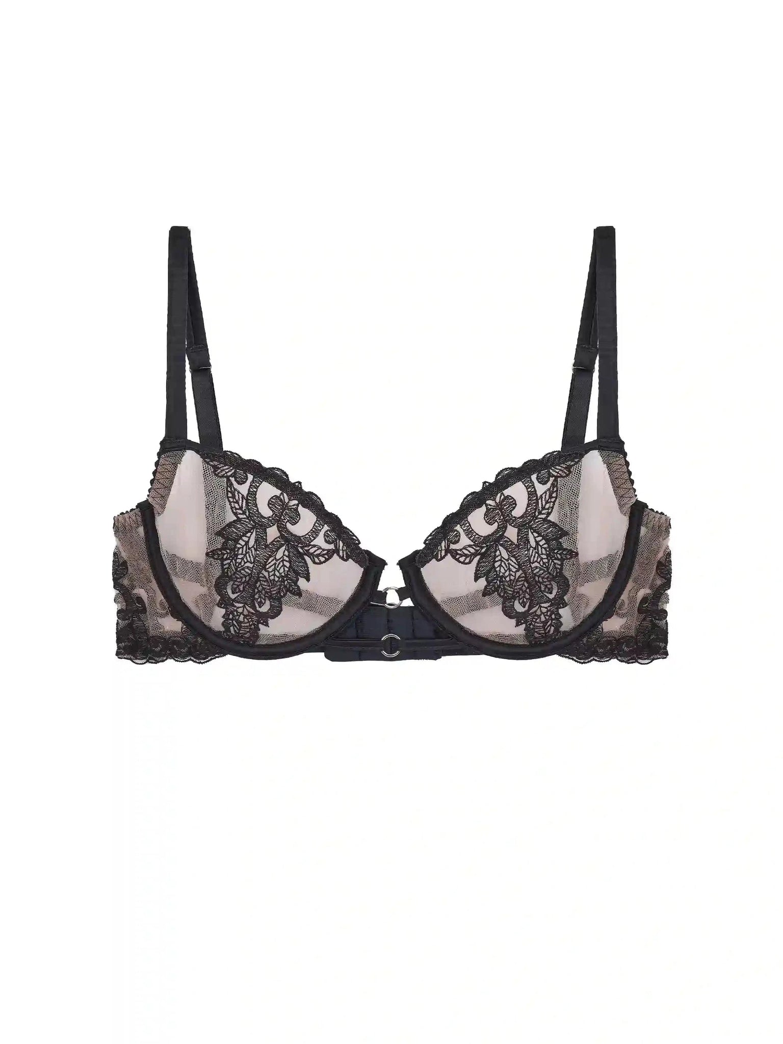Introducing the Onyx Demi Bra, a sensual underwired addition to the iconic Onyx collection. The demi bra features Italian tulle cups, self-lined for support, and a smooth, flattering fit. Embroidered motifs adorn the soft sheer Italian tulle, creating a striking look, leaving little to the imagination. Silk encased straps elevate this luxury bra further whilst providing ultimate comfort. The back of the bra features an alluring strap design with adjusters allowing you to find your perfect fit. This bra is uniquely available in sizes S, M, and L, making it an excellent choice for gifting.