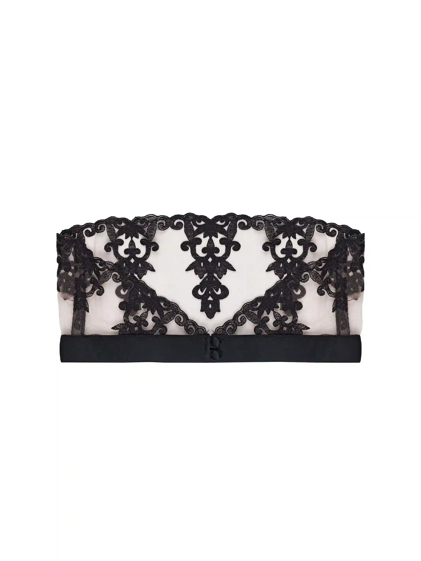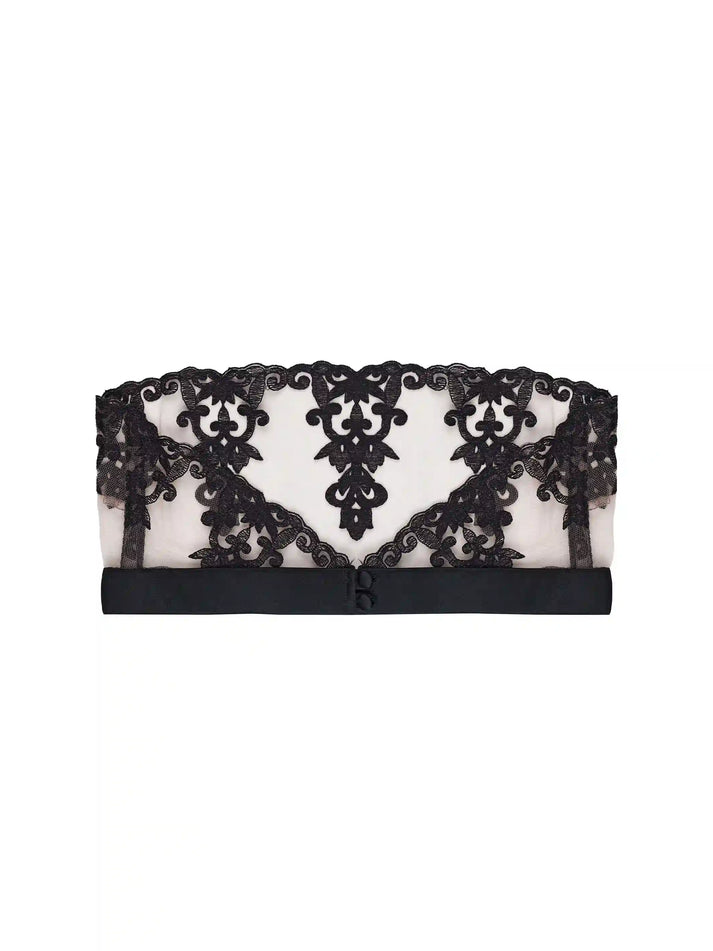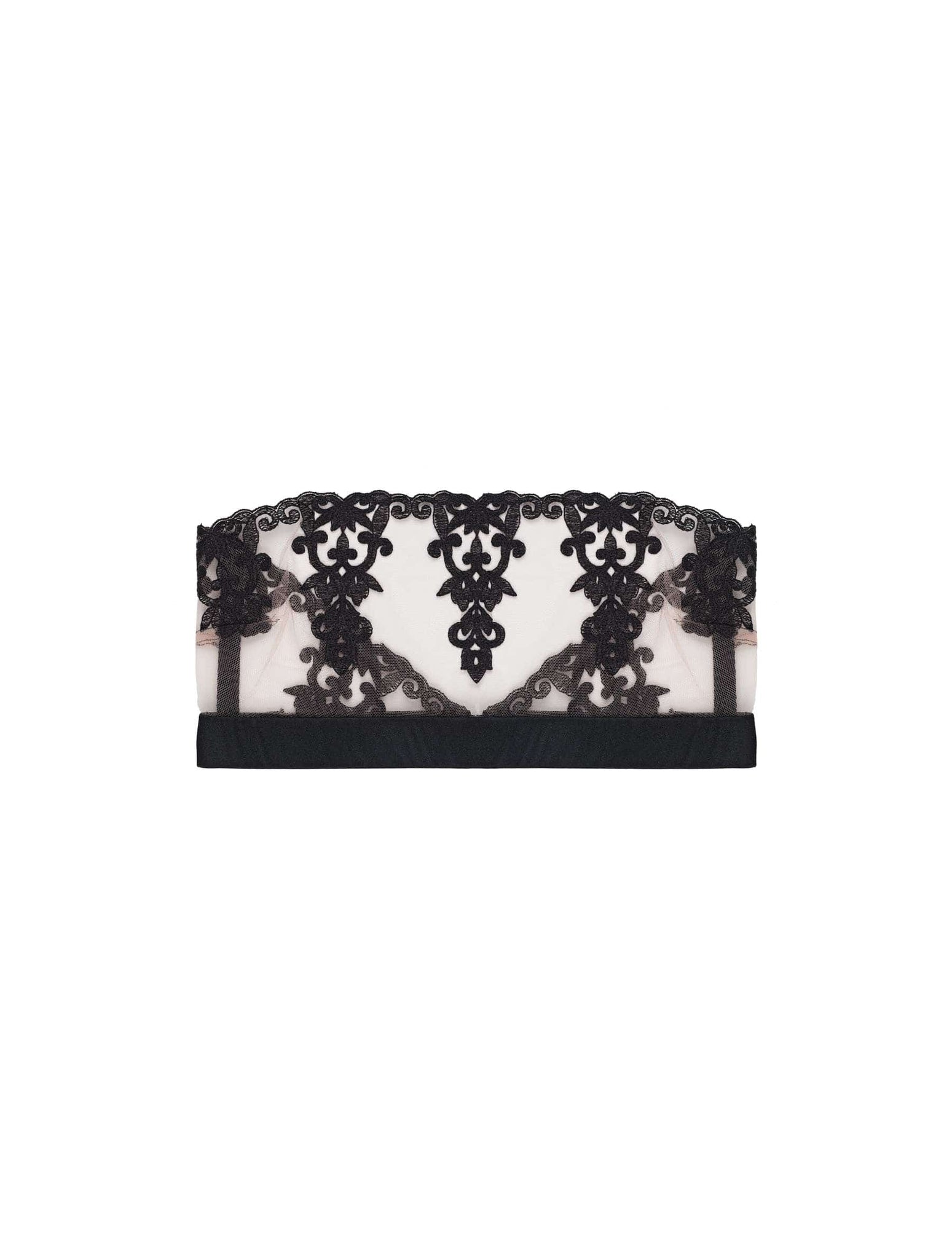 The Onyx strapless boudoir bra offers a strapless alternative to the classic boudoir triangle bra. Crafted in the most delicate sheer tulle and adorned with Fleur's bespoke embroidery, this bra truly is an exquisite piece of lingerie. The back of the bra features an elegant subtle V silhouette, beautifully framing the wearer's back and is fastened with 2 silk-covered buttons.