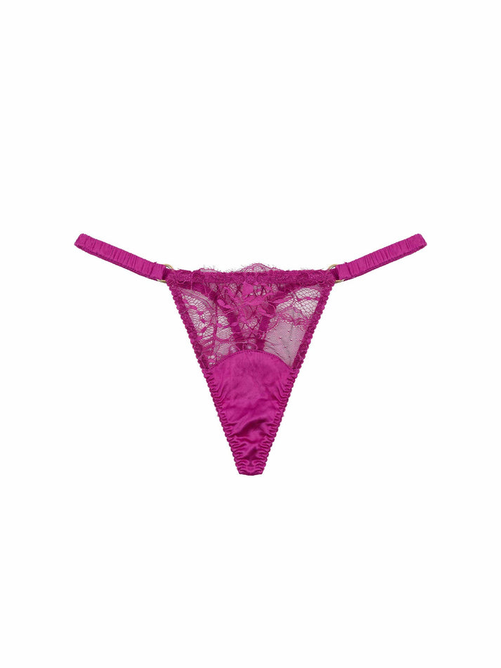 Our Bestselling silk side thong is reintroduced in fuchsia pink for the Paloma collection. Crafted in French lace and bespoke embroidery, with the exceptional comfort and luxurious wearability that Fleur of England is celebrated for, Silk-ruched side straps offer a flexible and flattering fit to this everyday style.